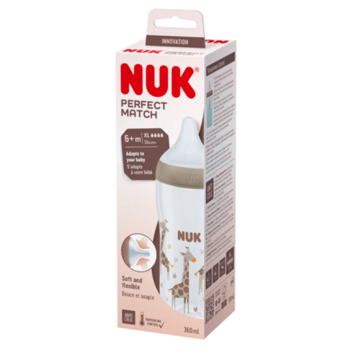 NUK Perfect Match шише 360мл со мека силиконска Anti-Colic цуцла 6+ месеци XL цуцла силикон и Temperature Control скала, BPA Free.