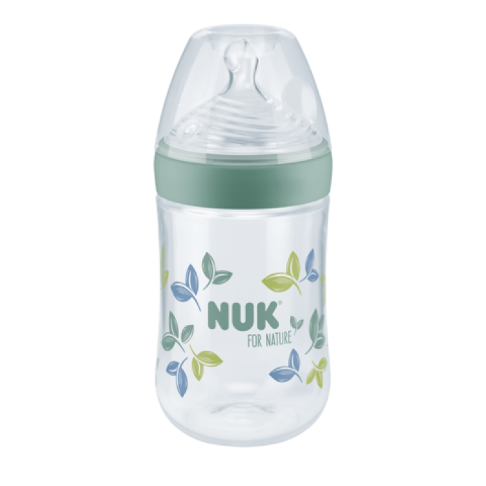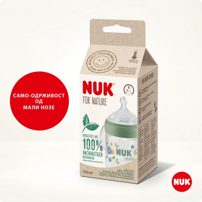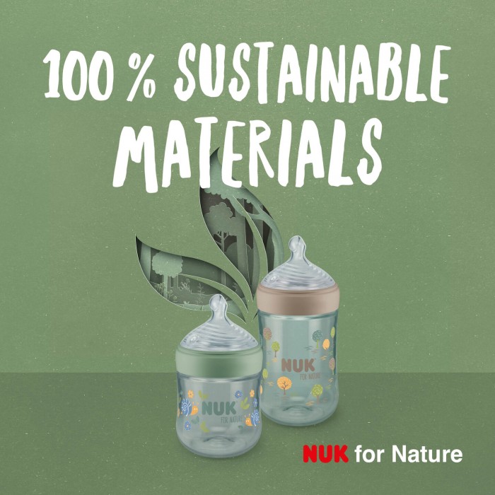 NUK For Nature колекција е најдброто за вашите деца, поради многуте функционални предности и поради тоа што само-одрживоста е подобра! NUK For Nature шишенцата се изработени од 100% само-одрживи (разградиви) материјали со (mass balance method) и со тоа не ја загадуваат природата: Anti-Colic цуцлата е изработена од мек природен силикон, сите останати делови се од разградива пластика. Сите NUK For Nature производи се пакувани во амбалажа која е од 100% био-разградива хартија.