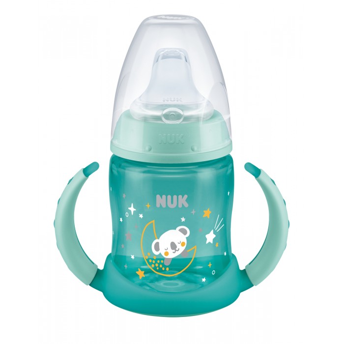 Со NUK First Choice+ шишенцата со рачки се овозможува благ и лесен премин од хранење со шишенце кон самостојно пиење. Шишенцето е опремено со меко силиконско клунче кое е некапечко и спречува да се прави неред. Интегрираниот NUK Anti Colic Air System спречува болни загрцнувања и грчеви, преку изедначување на воздушниот притисок. Клунчето е изработено од високо квалитетен силикон кој е хигиенски, лесен за одржување и отпорен на температура. Не содржи штетни состојки и е отпорен на вриење. Анатомските рачки кои можат да се одвојат од шишенцето нудат сигурност за децата кои го користат ова шишенце.