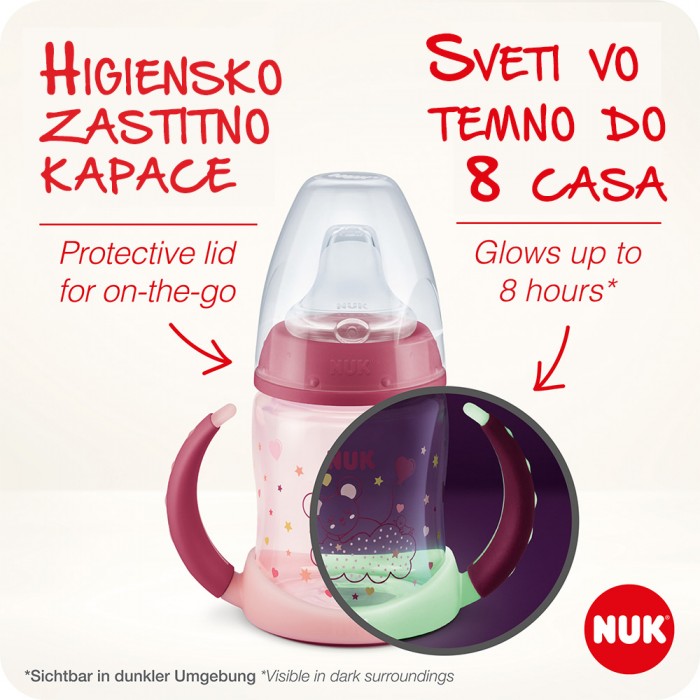 Пссст! Да ги оставиме мама и тато да поспијат уште малку. Зарем не е прекрасен моментот кога вашето дете ќе научи самостојно да пие и тоа особено во текот на ноќта? Благодарение на новата NUK Чашка со Glow in the Dark ефект овој следен чекор во растењето стана многу полесен, за децата но и за родителите. Рачките и дното на чашката се флуросцентни и истите светат до 8 часа во текот на ноќта што ја прави лесна за пронаоѓање во секоја ситуација во текот на ноќта без да ги будиме мама и тато. Чашката е направена од специјален материјал кој изложен на дневна светлина абсорбира енергија која ја манифестира во вид на светлина во текот на ноќта. Оваа чашка е воедно и некапечка, па така во текот на ноќта нема да се направи неред.