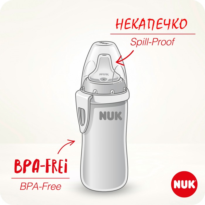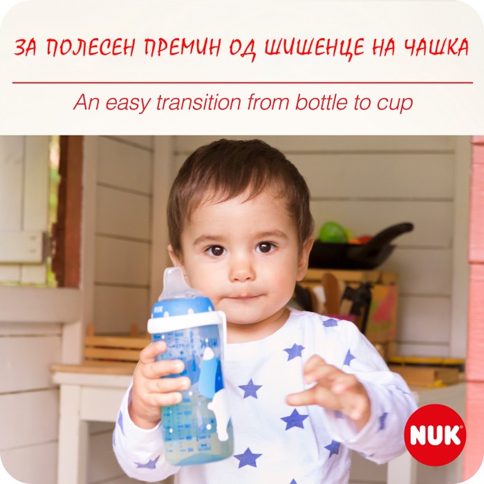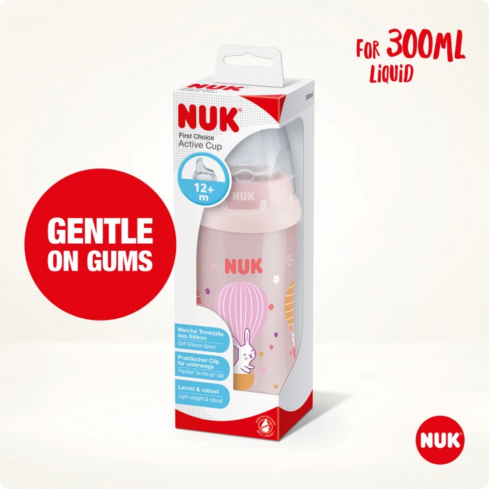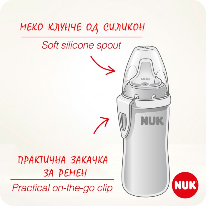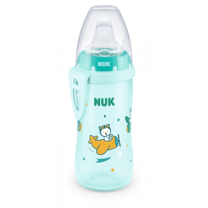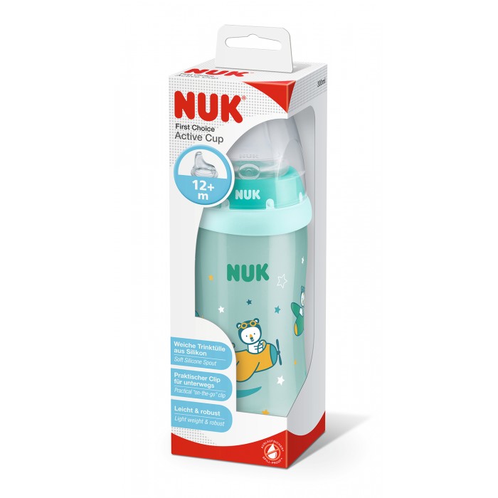 Она што децата најмногу го сакаат е истражувањето, колку повеќе растат толку повеќе сакаат да го поминуваат времето во игра надвор од домот. Многуте возбудувања често децата ги прават жедни. Затоа тука е Аctive Cup кој без потреба од прекин на забавата ќе ја гаси жедта уште во текот на играта. Со својот голем капацитет од 300мл одговара на потребите на активните деца. Силиконското некапечко клунче спречува правење на неред дома и истурање на содржината на Актив Кап. Anti Colic Air System (вентилот) на клунчето спречува болни загрцнувања и гасови. Шишенцето и деловите можат да се мијат во машина за садови. Со закачка за ранец или ремен за активните деца да имаат слободни раце во секое време. Изработено од видоко квалитетен Полипропилен, кој е некршлив и траен, но пред се безбеден и хигиенски материјал. Компатибилно со сите елементи на NUK First Choice+ програмата.
