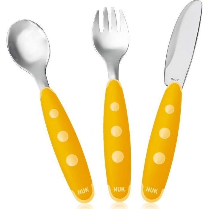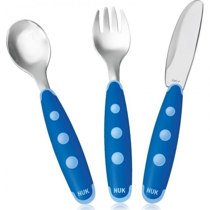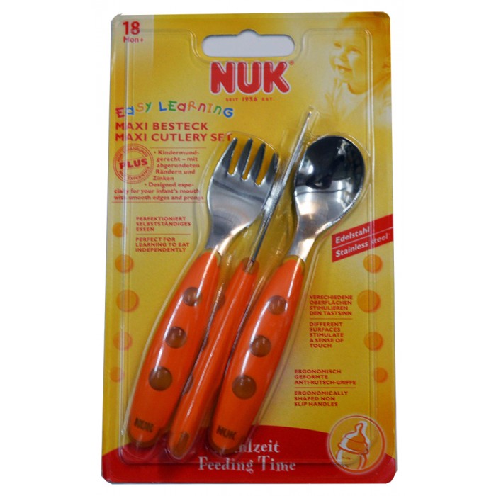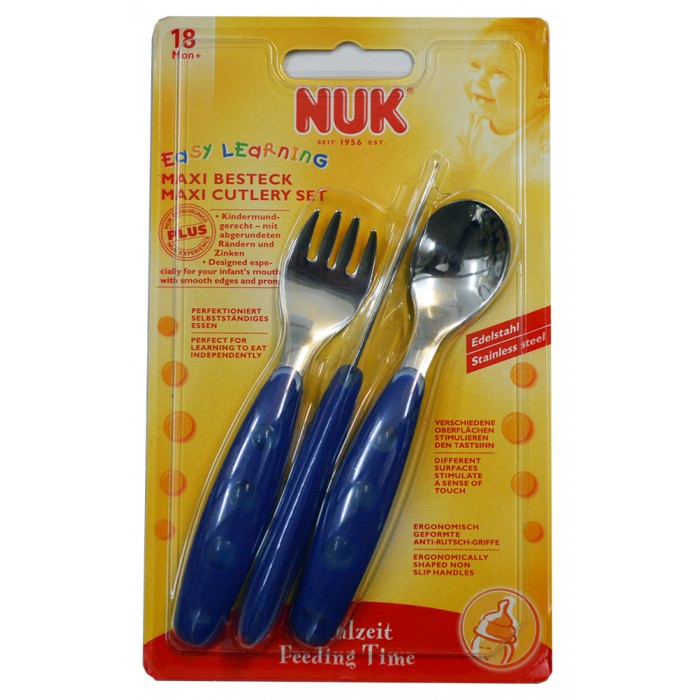 Најголемиот предизвик за децата кога малку ќе потпораснат е да ги имитираат однесувањето и навиките на возрасните. Поголеми сме и работите одат малку полесно, веќе сме го совладале јадењето со лажица и вилушка, нo сега ножот е нов предизвик. NUK EASY LEARNING Макси Сетот им овозможува на децата да јадат како големи. Составен од нож, лажица и вилушка од високо-квалитетен нерѓосувачки челик, овој сет е анатомски прилагоден на децата. Има мали димензии и е прилагоден на устата на децата на оваа возраст, рачките се анатомски и нелизгави, а врвовите заоблени и безбедни за користење. Сетот е наменет за деца од 18 месеци.