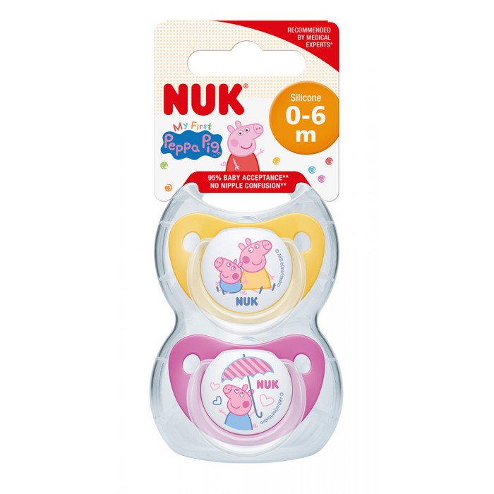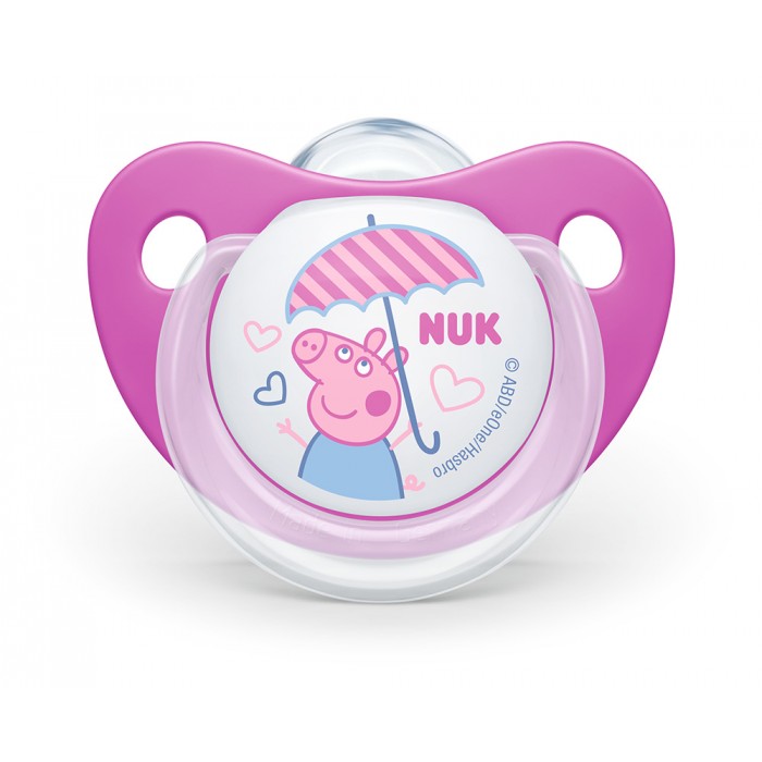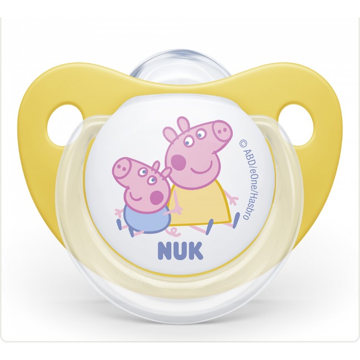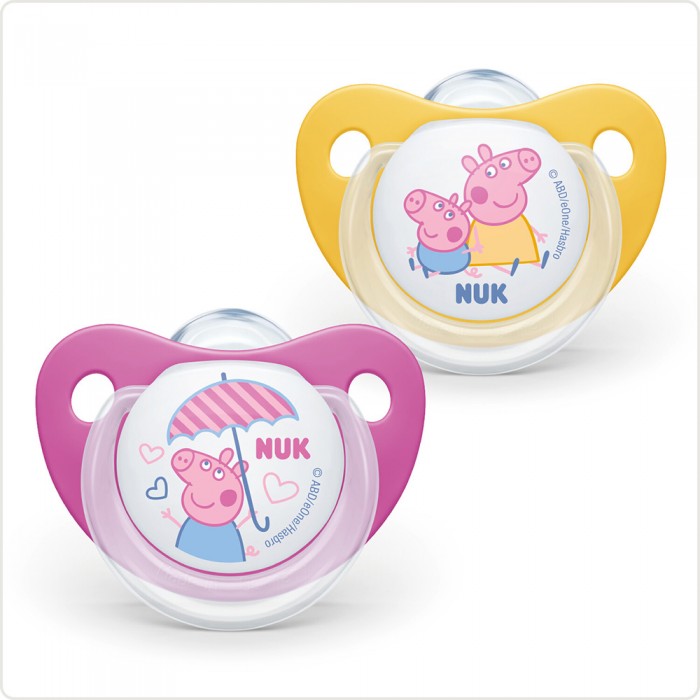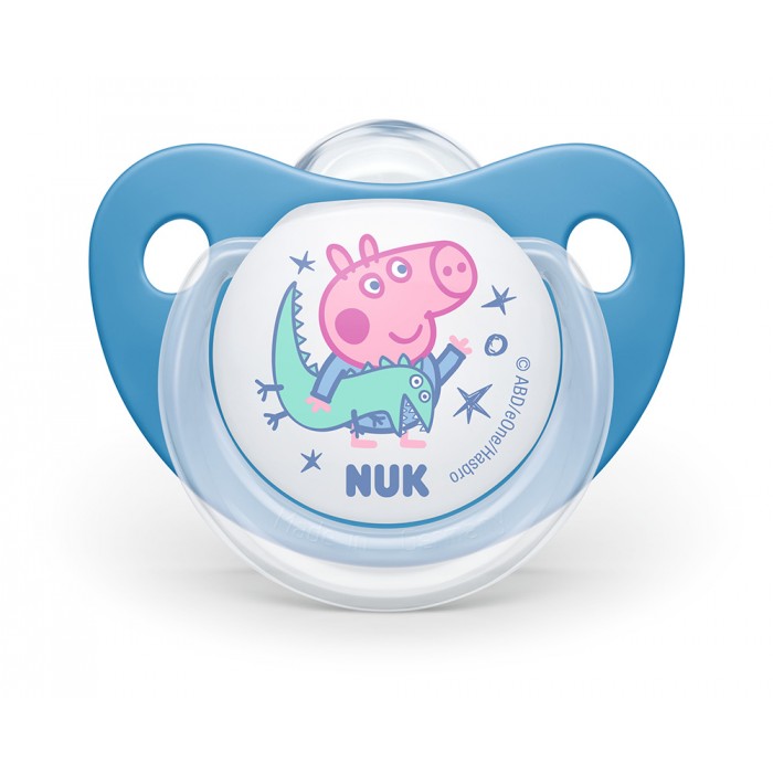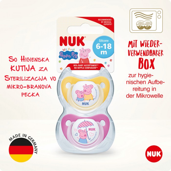 NUK Peppa Pig цуцлата доаѓа со некршлива хигиенска кутија која може да се користи и како сад за брза стерилизација на цуцлата во микро бранова печка. NUK цуцлите се произведени во Германија согласно највисоките стандарди за безбедност и квалитет и врз основа на официјална Disney лиценца.