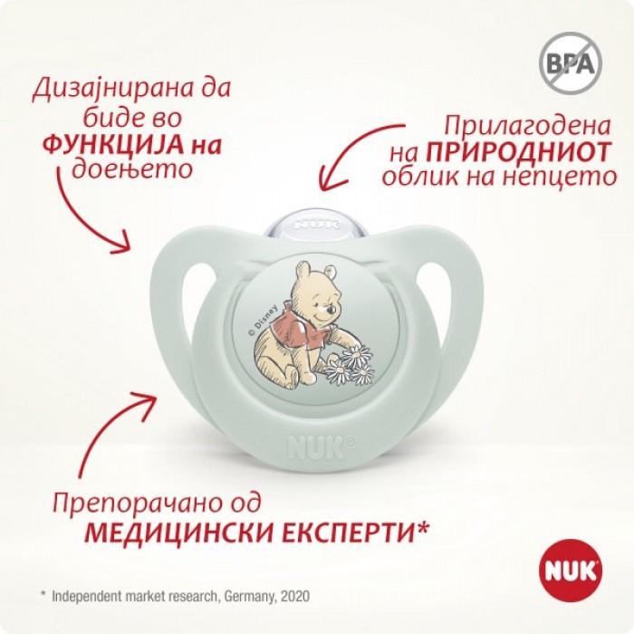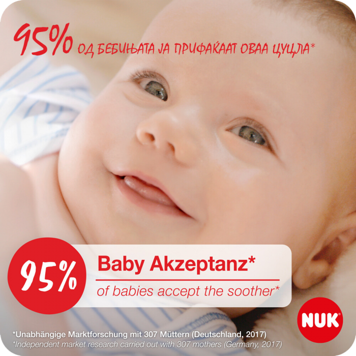 100% од Германските ортодонти тврдат дека анатомските NUK цуцли не предизвикуваат деформации**. 95% од бебињата во Германија ги прифаќаат без проблем NUK анатомските цуцли*. 90% од германските мајки би ги препорачале NUK анатомските цууцли на други*, а 92% од германските доилки тврдат дека NUK цуцлите лажалки не влијаат врз доењето*.*