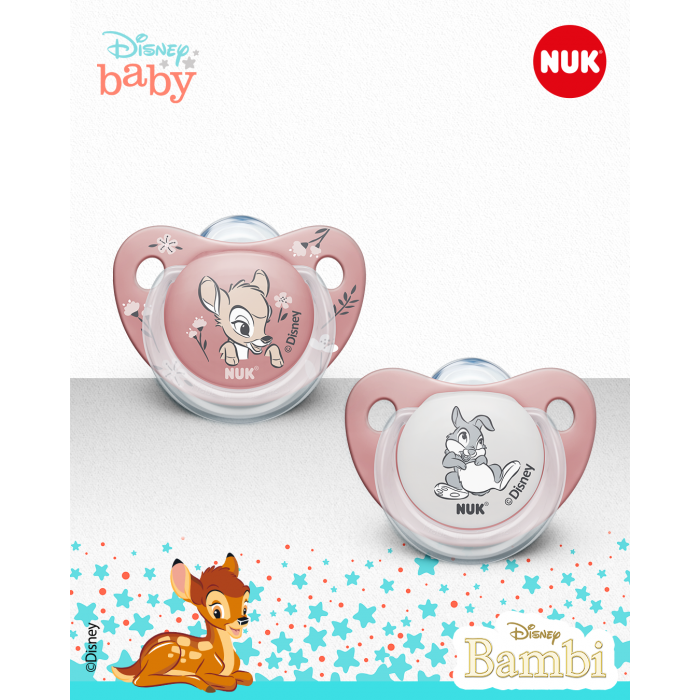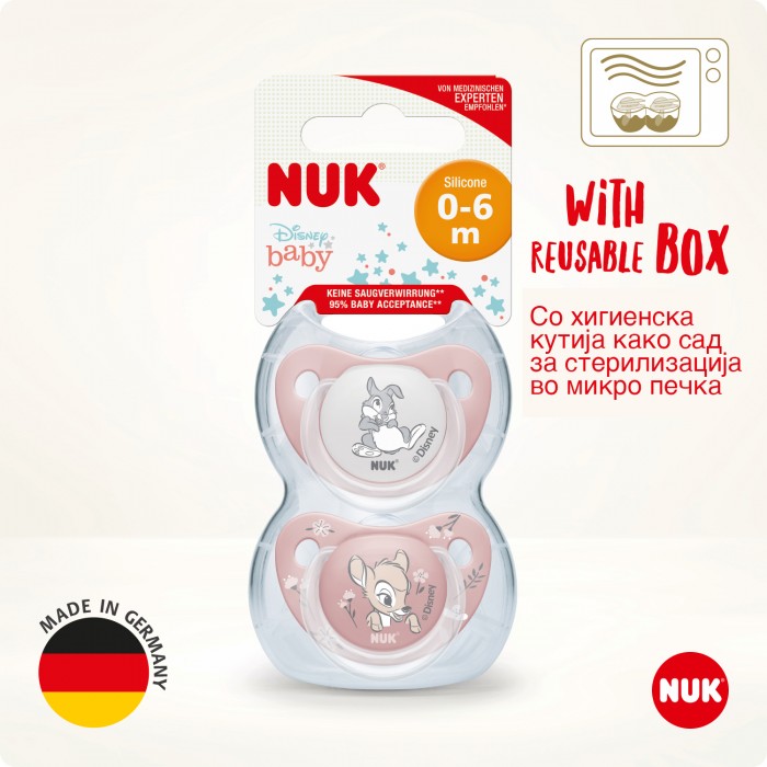 NUK Disney Bambi цуцлата доаѓа со некршлива хигиенска кутија која може да се користи и како сад за брза стерилизација на цуцлата во микро бранова печка. NUK Disney Bambi цуцлите се произведени во Германија согласно највисоките стандарди за безбедност и квалитет и врз основа на официјална Disney лиценца.