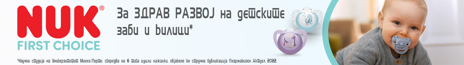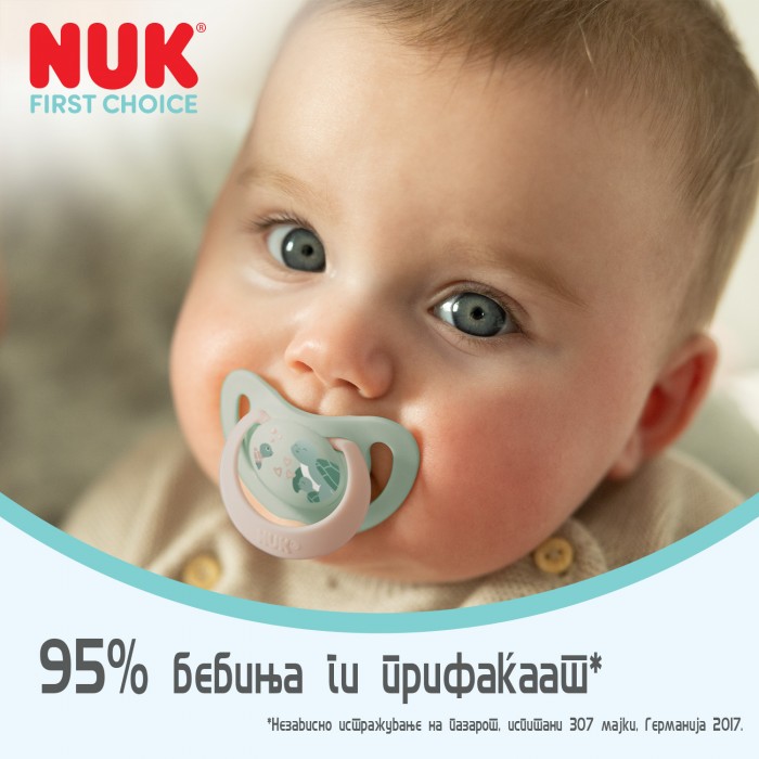 100% од Германските ортодонти тврдат дека анатомските NUK цуцли не предизвикуваат деформации**. 95% од бебињата во Германија ги прифаќаат без проблем NUK анатомските цуцли*. 90% од германските мајки би ги препорачале NUK анатомските цууцли на други*, а 92% од германските доилки тврдат дека NUK цуцлите лажалки не влијаат врз доењето***.