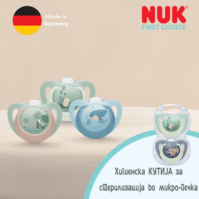 NUK First Choice Night цуцлите доаѓаат со некршлива хигиенска кутија која може да се користи и како сад за брза стерилизација на цуцлата во микро бранова печка. NUK First Choice Night цуцлите се произведени во Германија согласно највисоките стандарди за безбедност и квалитет и врз основа на официјална Disney лиценца.