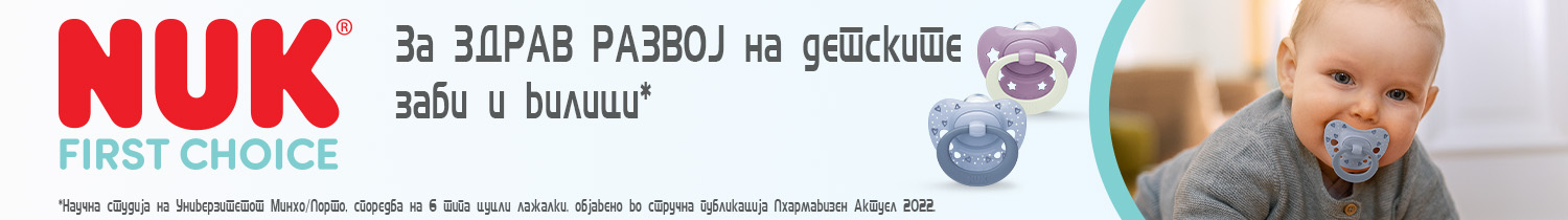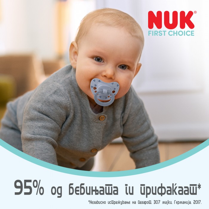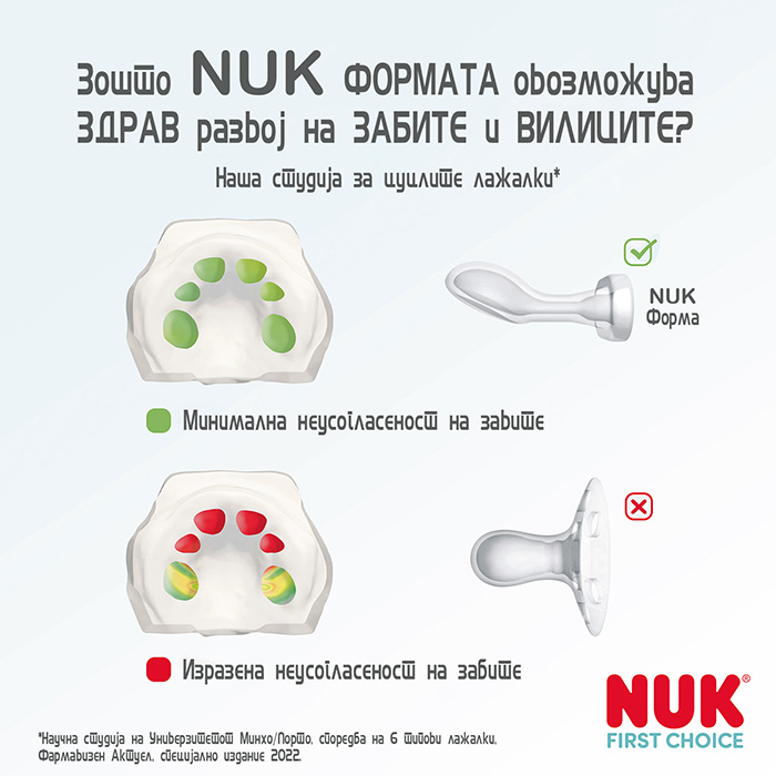100% од Германските ортодонти тврдат дека анатомските NUK цуцли не предизвикуваат деформации**. 95% од бебињата во Германија ги прифаќаат без проблем NUK анатомските цуцли*. 90% од германските мајки би ги препорачале NUK анатомските цууцли на други*, а 92% од германските доилки тврдат дека NUK цуцлите лажалки не влијаат врз доењето***.