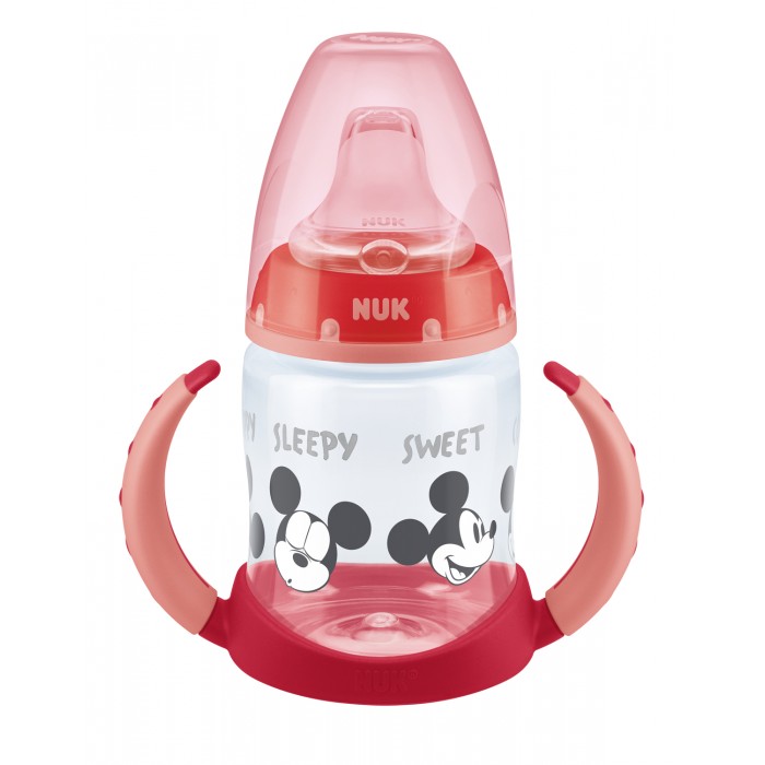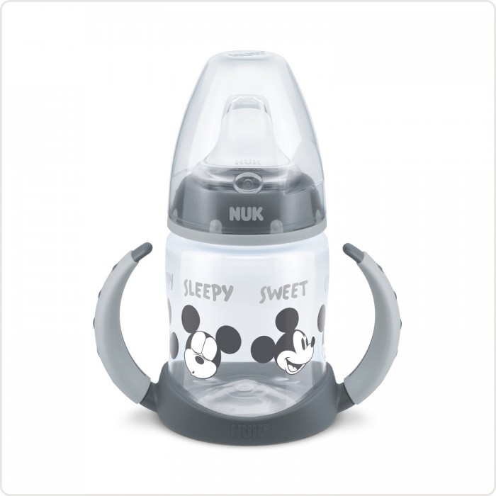Со NUK First Choice+ шишенцата со рачки се овозможува благ и лесен премин од хранење со шишенце кон самостојно пиење. Шишенцето е опремено со меко силиконско клунче кое е некапечко и спречува да се прави неред. Интегрираниот NUK Anti-Colic Air System спречува болни загрцнувања и грчеви, преку изедначување на воздушниот притисок. Клунчето е изработено од високо квалитетен силикон кој е хигиенски, лесен за одржување и отпорен на температура. Не содржи штетни состојки и е отпорен на вриење. Анатомските рачки кои можат да се одвојат од шишенцето нудат сигурност за децата кои го користат ова шишенце.