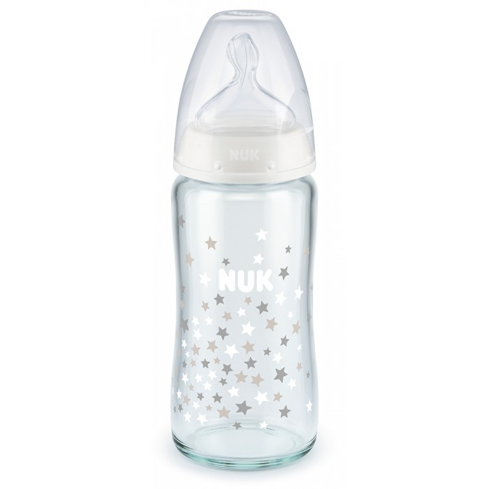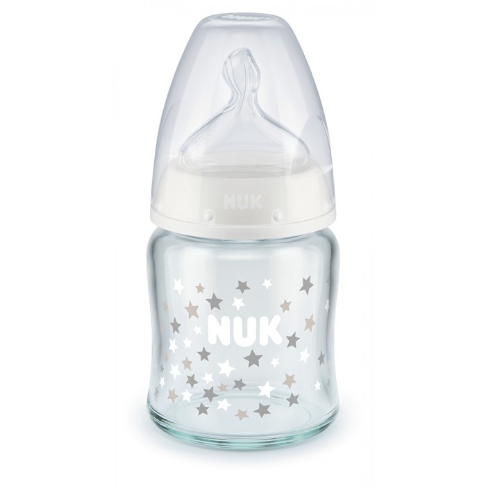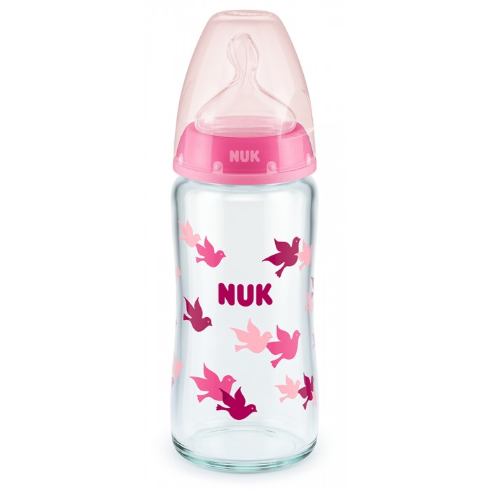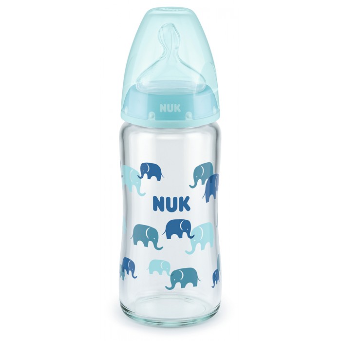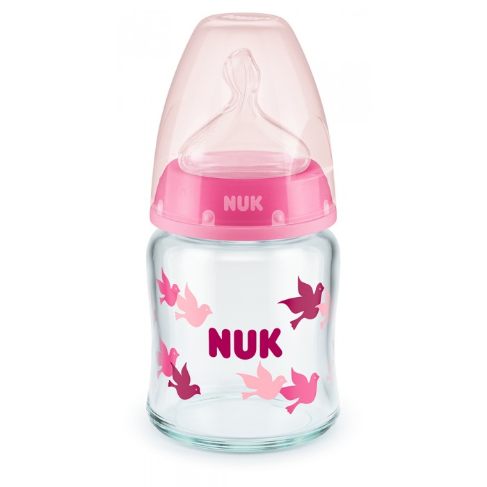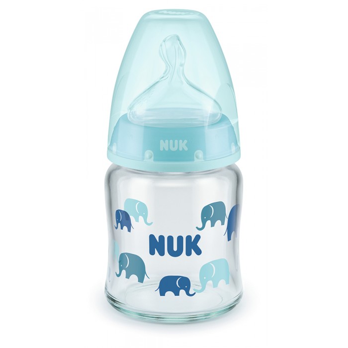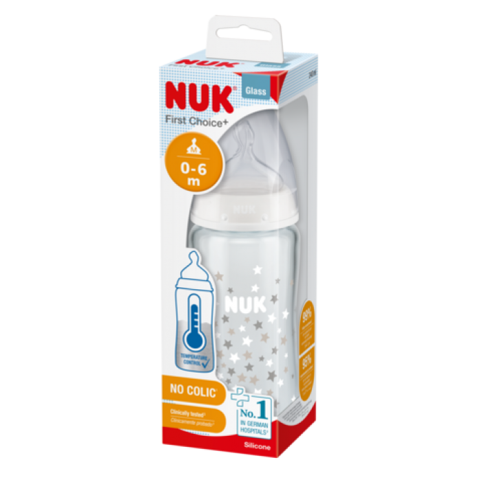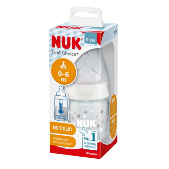 Со NUK First Choice+ програмата е направен уште еден чекор поблиску кон природниот начин на исхрана. First Choice+ цуцлата за шише има облик ма мајчина брадавица во моментот на доење и воедно го помага правилниот орален развој кај децата. Самата форма на цуцлата остава доволно простор за правилно и непречено функционирање на јазикот и долната вилица при цицање. Меката зона во горниот дел на цуцлата овозможува нејзино идеално прилагодување кон непцето без непотребен притисок врз истото. Anti-Colic Air системот претставен преку вентилот на цуцлата врши компензација на воздушниот притисок во шишенцето и спречува болни загрцнувања и гасови. Шишенцето е изработено од првоклсно стакло - боросиликат.