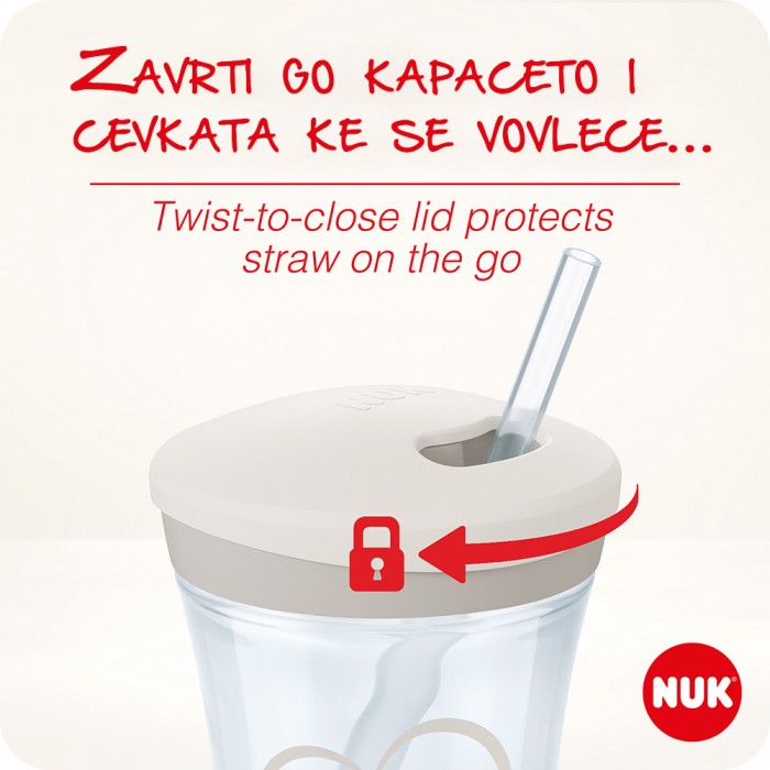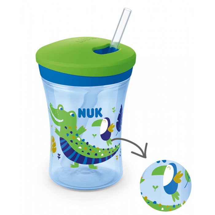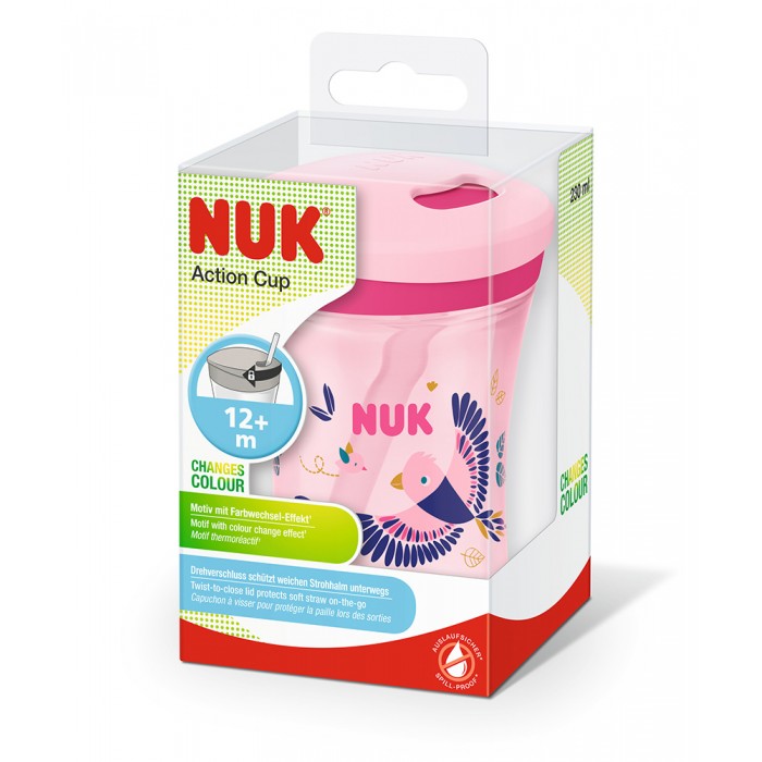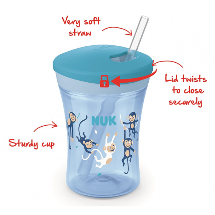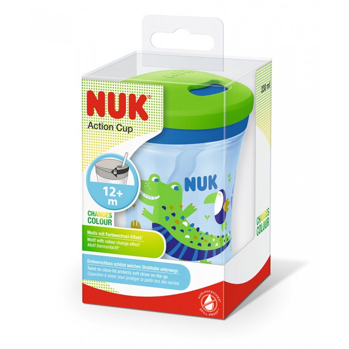 NUK Action Cup е чаша наменета за деца од 12 месеци, т.е. за оние деца кои се веќе доста активни, многу се движат и физичката активност е во прв план. Некапечката цевка е исклучително мека и еластична и не може да предизвика повреди. Со едноставно ротирање на капакот цевката се вовлекува и е потполно заштитена. Чашката поседува специјален силиконски вентил кој овозможува непречен проток и лесно пиење.