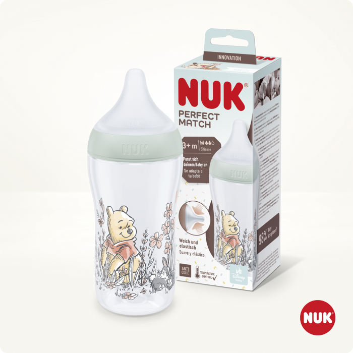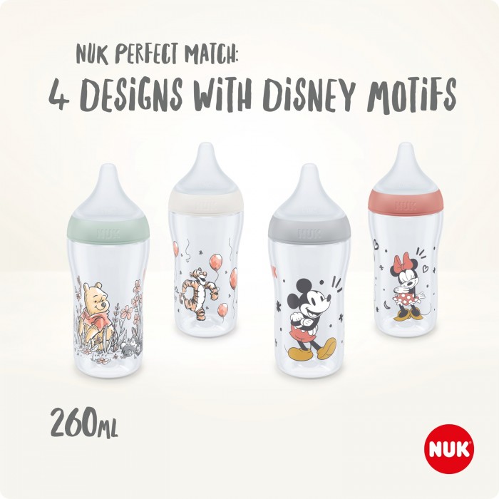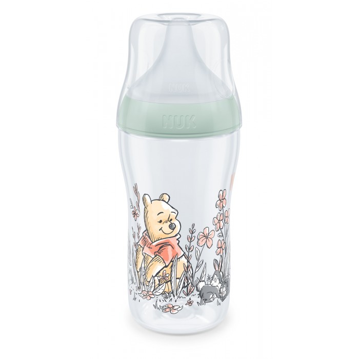 NUK Perfect Match Disney Winnie The Pooh шише 260мл со мека силиконска Anti-Colic цуцла 6+ месеци и Temperature Control скала, BPA Free.