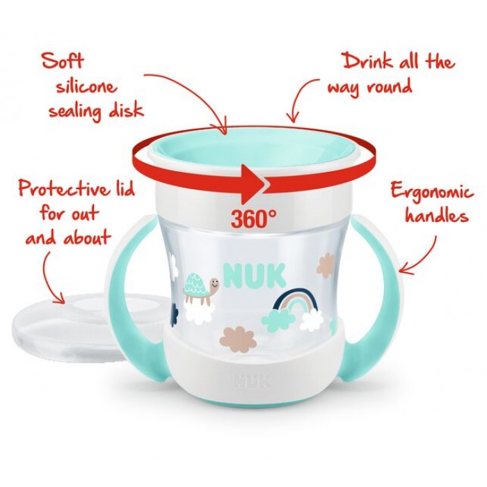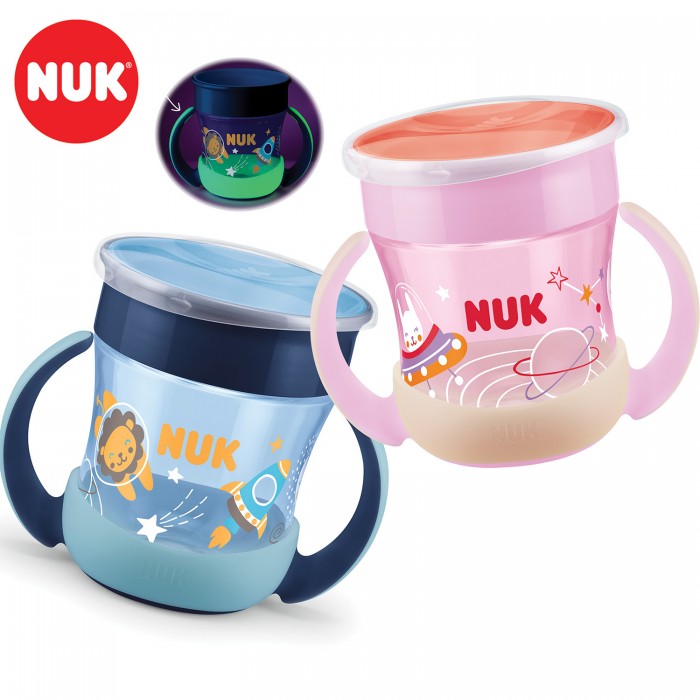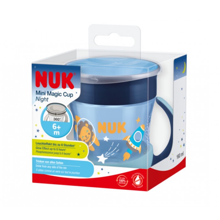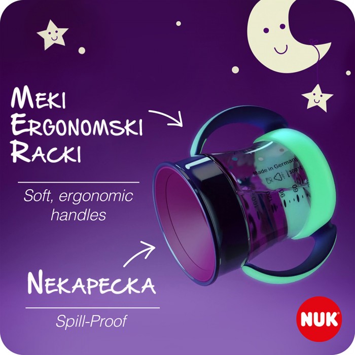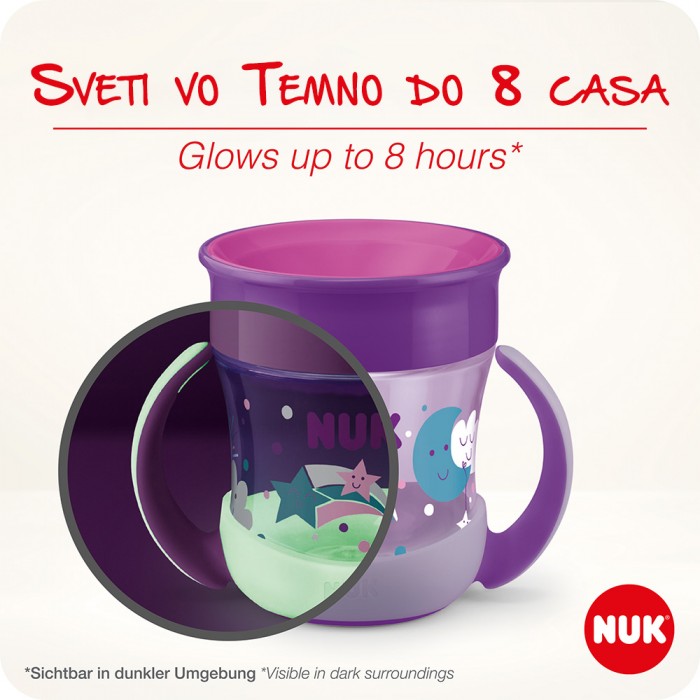 Пссст! Да ги оставиме мама и тато да поспијат уште малку. Зарем не е прекрасен моментот кога вашето дете ќе научи самостојно да пие и тоа особено во текот на ноќта? Благодарение на новата NUK Mini Magic Cup со Glow in the Dark ефект овој следен чекор во растењето стана многу полесен, за децата но и за родителите. Рачките и дното на чашката се флуросцентни и истите светат до 8 часа во текот на ноќта што ја прави лесна за пронаоѓање во секоја ситуација во текот на ноќта без да ги будиме мама и тато. Чашката е направена од специјален материјал кој изложен на дневна светлина абсорбира енергија која ја манифестира во вид на светлина во текот на ноќта. Оваа чашка е воедно и некапечка, па така во текот на ноќта нема да се направи неред.