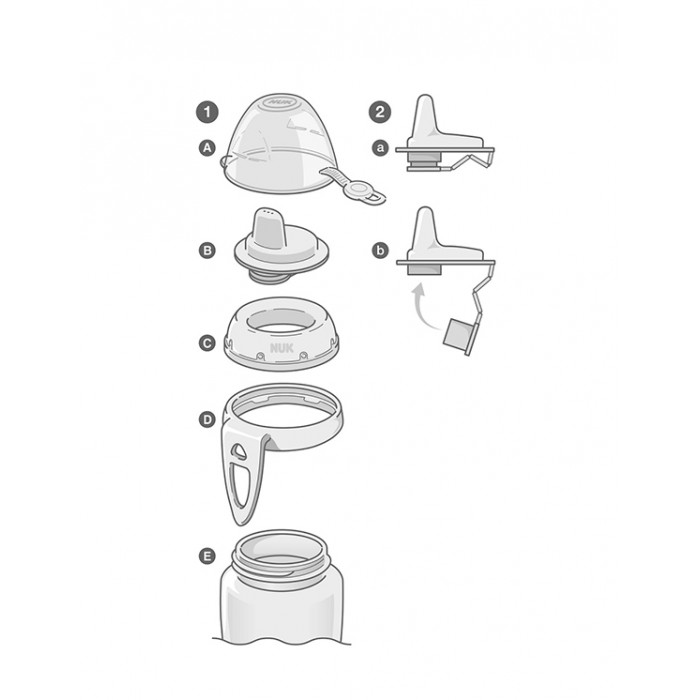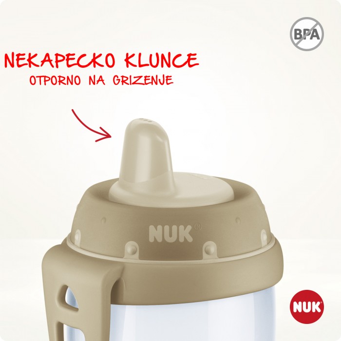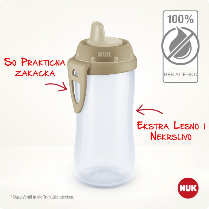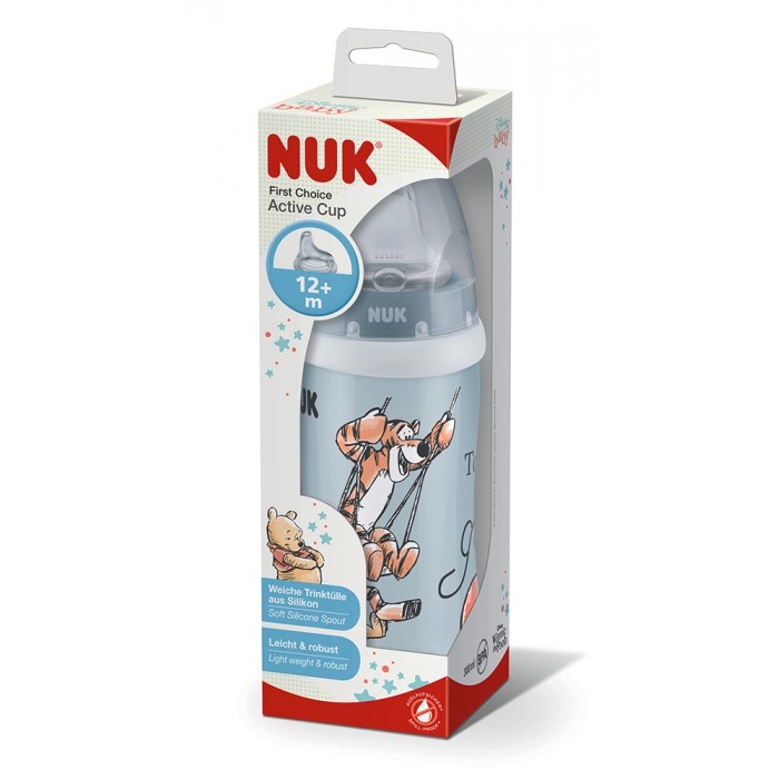 Она што децата најмногу го сакаат е истражувањето, колку повеќе растат толку повеќе сакаат да го поминуваат времето во игра надвор од домот. Многуте возбудувања често децата ги прават жедни. Затоа тука е Аctive Cup кој без потреба од прекин на забавата ќе ја гаси жедта уште во текот на играта. Со својот голем капацитет од 300мл одговара на потребите на активните деца. Силиконското некапечко клунче спречува правење на неред дома и истурање на содржината на Актив Кап. Anti Colic Air System (вентилот) на клунчето спречува болни загрцнувања и гасови. Шишенцето и деловите можат да се мијат во машина за садови. Со закачка за ранец или ремен за активните деца да имаат слободни раце во секое време. Изработено од видоко квалитетен Полипропилен, кој е некршлив и траен, но пред се безбеден и хигиенски материјал. Компатибилно со сите елементи на NUK First Choice+ програмата.