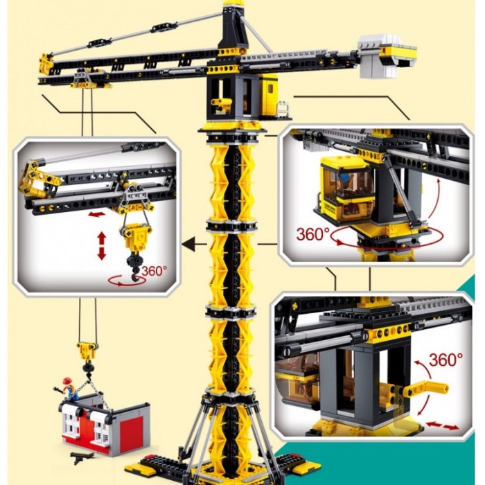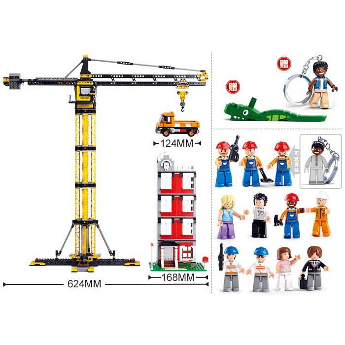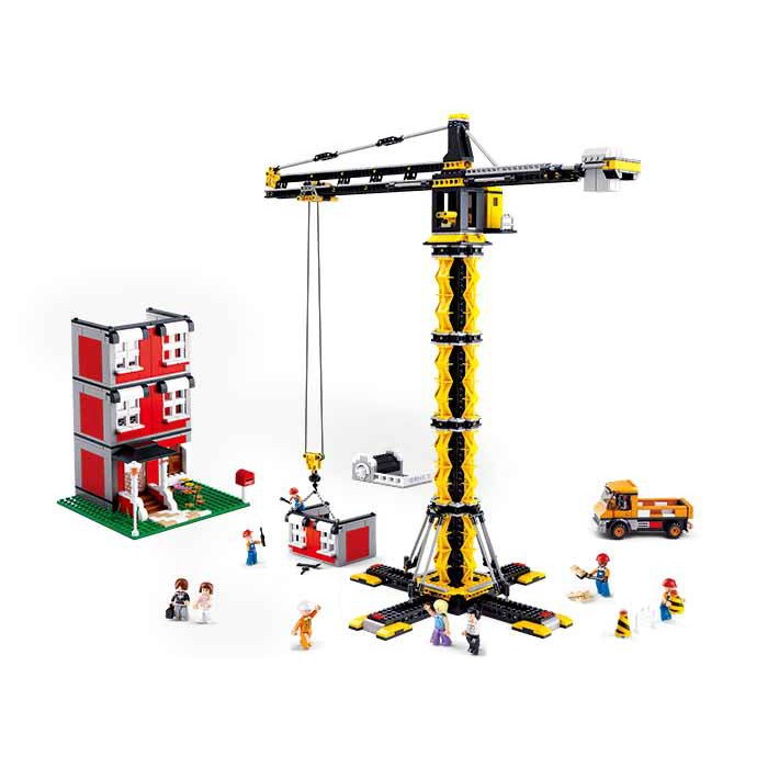 Sodrzina Vertikalen kran, zgrada i kamionce vo set od 1461 kocka i 11 figuri.