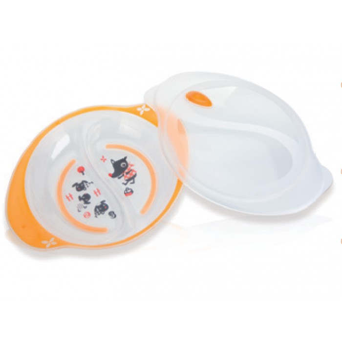 • Плиток тањир со поделоци, нелизгаво дно и капак за затоворање.