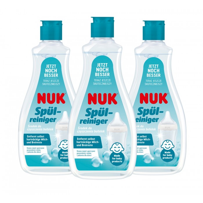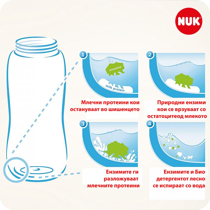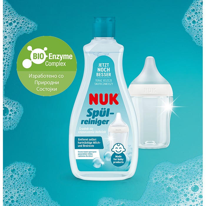 NUK Био детергентот е базиран на потполно природни ензими кои на брз и едноставен начин ги разградуваат остатоците од беби храна од цуцлите, шишенцата и друг беби прибор. Се работи за ензими кои имаат посебно силно дејство кон остатоците на храна како што се млеко, мајчино млеко, кашички и сокови и кои потоа лесно се измиваат со вода. Био Детергентот може да се користи за миење на цуцли, шишенца, чашки, тањири, беби играчки како и други производи кои доаѓаат во контакт со устата на децата.