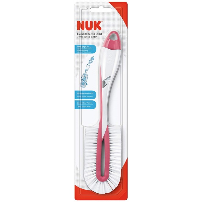 NUK четката Twist е специјално дизајнирана за миење на остатоци од храна од цуцлите и шишенцата. Благодарение на цврсто поставените најлонски влакна можно е правилно и целосно миење на остатоците од храна. Малата четка за миење цуцли е сместена во рачката на поголемата четка. Ергономскиот облик на рачката овозможува соодветен притисок и правилно миење. За подобри ефекти при миење може да ја користите НУК Био течноста за миење на беби приобор - артикал 10256361.
